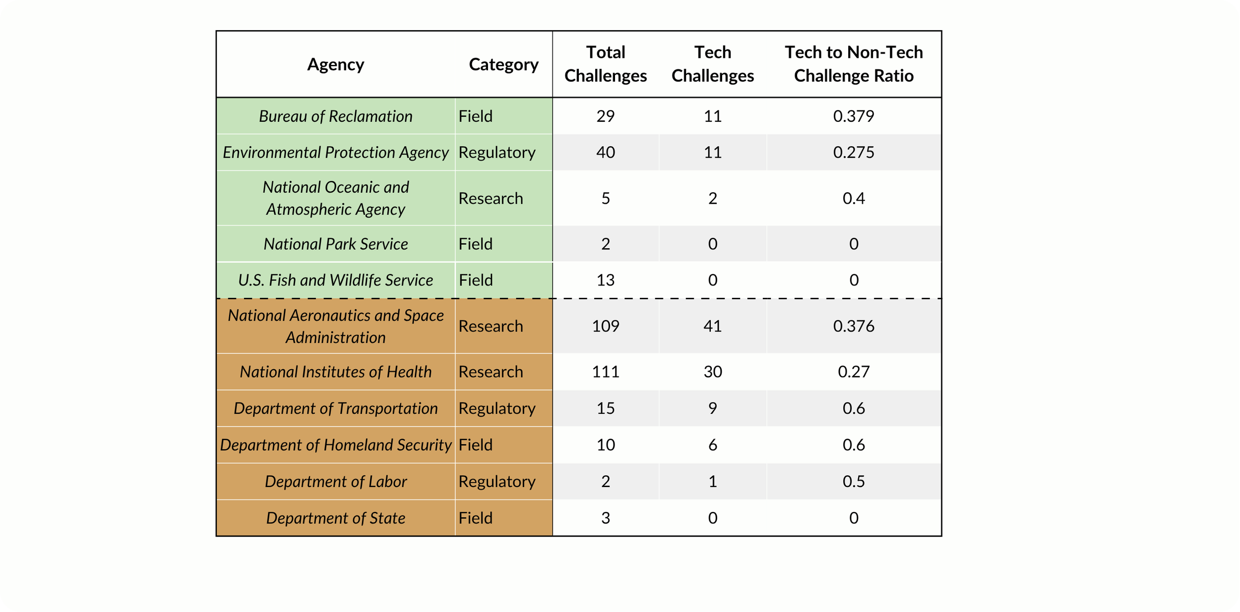 As we’ve seen in other indicators, Field agencies are lagging behind on technology challenges, with the exception of the Bureau of Reclamation, which leads all environmental agencies with 11 technology challenges offered in this window.