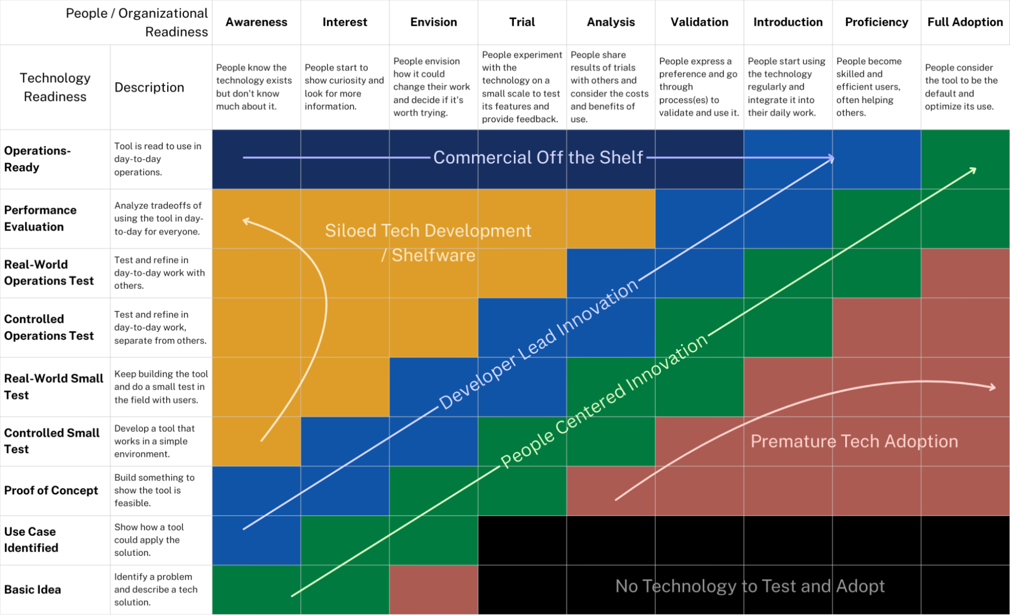 Matrixing People Readiness with Technology Readiness helps visualize the progression (and pitfalls) that many technology developers and adopters face when working together. The most typical paths to technology adoption that we see are Developer Lead Innovation (where a technology developer tries to bring the adopting org along with them) and Commercial-off-the-shelf (COTS) adoption (where a tool that has been built and deployed in some organizations is brought to a new one, for example in a new state government). These models of adoption can work, but often the most successful path to full adoption is a People Centered Innovation model. People Centered Innovation is when the adopting agency takes the lead on developing a clear problem statement, exploring different technological approaches, and then iteratively working with a developer to refine and test the technology while training its workforce to use it. If technology and people's readiness progress at different rates, technology development can easily veer off course becoming siloed from the organizations it's meant to serve or deployed too early losing credibility through poor performance. Looking at technology adoption across these two dimensions can help everyone involved plan the steps needed to get to the desired state and set realistic goals and expectations.