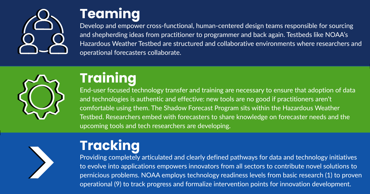 Not doing so will waste time and resources developing innovations that answer the wrong questions, fail when deployed, or simply don’t get adopted at all. Beyond that, the WFIC faces a particular challenge as an integrator of operations housed in other institutions. They must evaluate, adapt, and coordinate needs, resources, and capabilities from across those institutions to deliver on the opportunity in front of them.