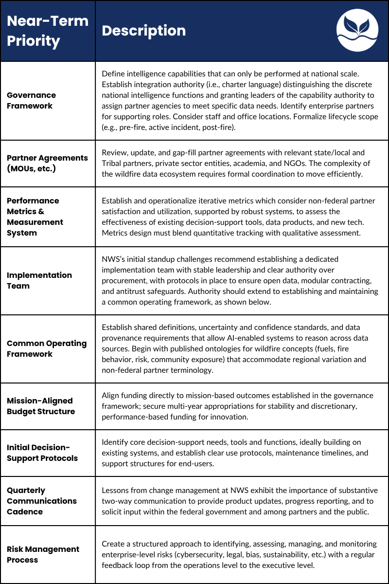 Drawing from interviews within the fire community, existing research, and a case study of the National Weather Service (NWS), we’ve identified the following achievable governance priorities for the first 18-24 months of a national wildfire intelligence system: