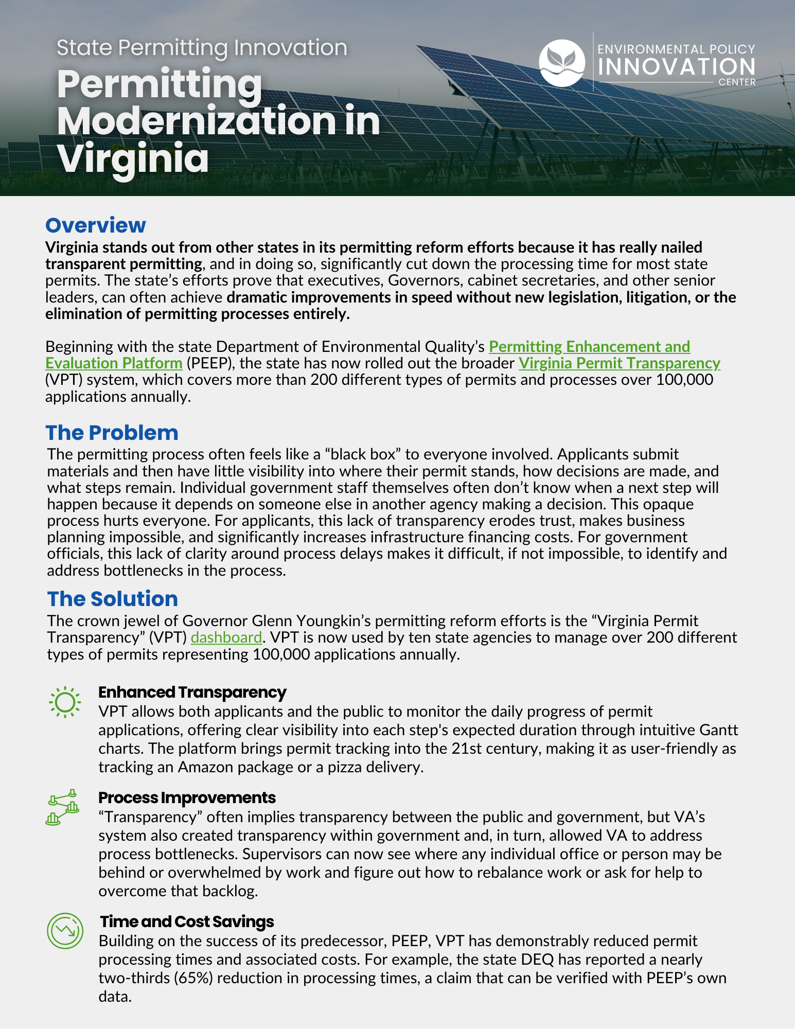 Beginning with the state Department of Environmental Qualities’ Permitting Enhancement and Evaluation Platform (PEEP), the state has now rolled out the broader Virginia Permit Transparency (VPT) system, which covers more than 200 different types of permits and processes over 100,000 applications annually.