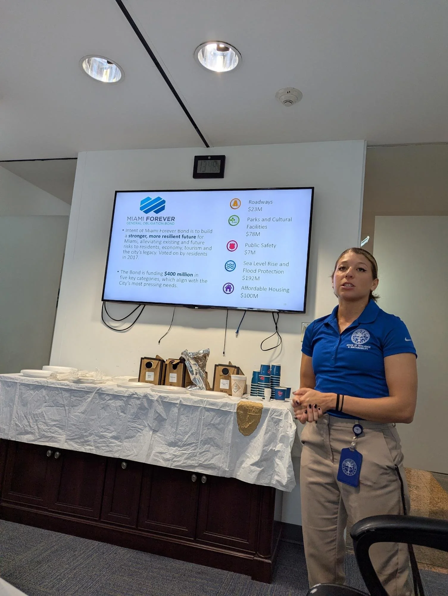 Finally, we were treated to an inspiring presentation by Allisa Farina, Assistant Chief Resilience Officer, showcasing the evolution of the City’s resilience office, planning, and strategic plans. She described how her team is designing for the Miami of the Future by building a public public infrastructure to withstand a specific threshold of flooding and sea level rise. Some of this work is governed by local codes and land-use regulations, others are in accordance with new laws implemented at the state level. We were excited to learn that Miami integrates adaptive management into how it plans and funds capital projects. This allows the city to increase infrastructure resilience based on available resources, with the option to add interventions later as risks evolve and as funding becomes available. These are the kinds of innovations that can speed and scale resilience at the pace needed.