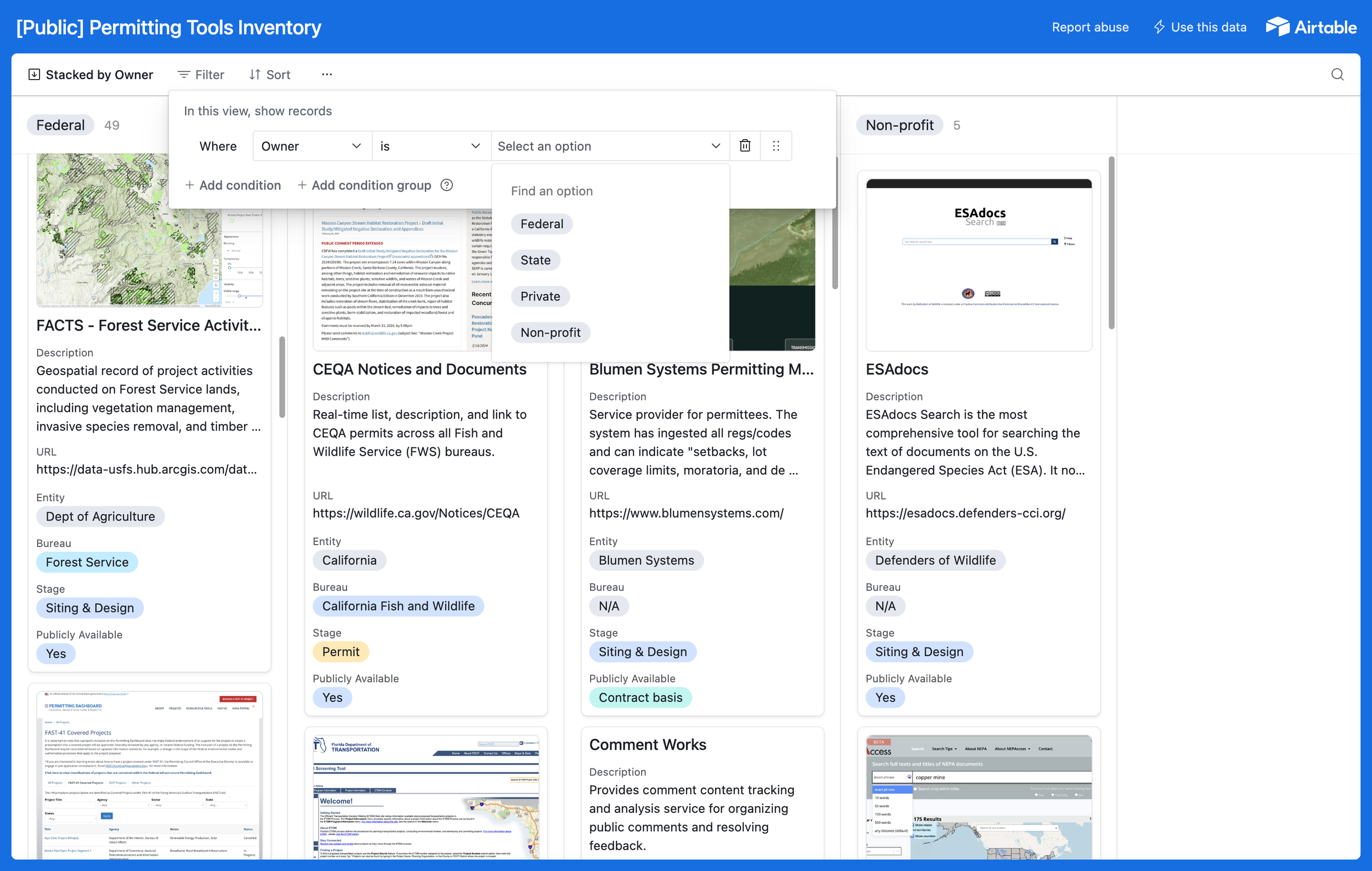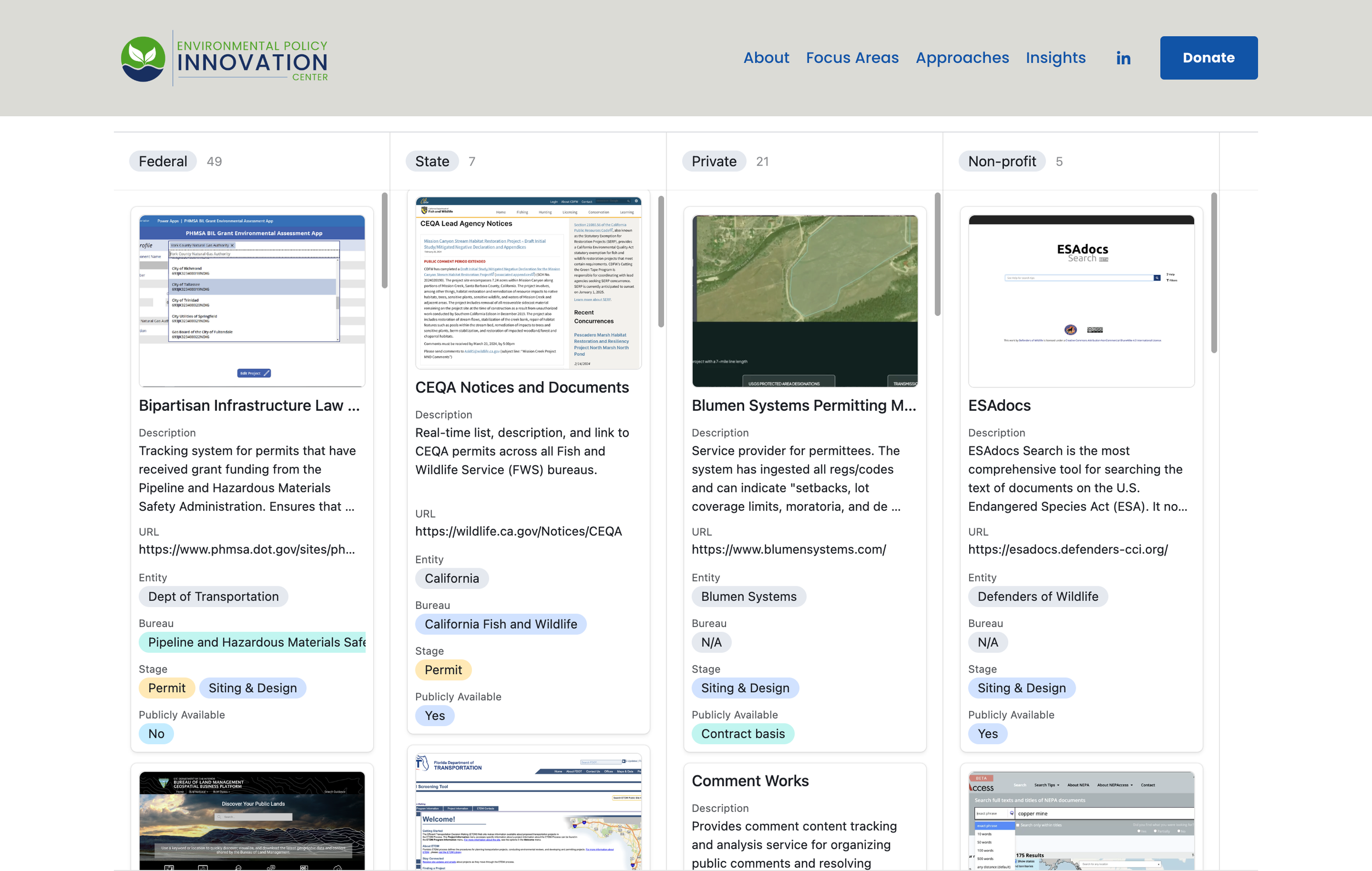 the tl;dr In this first major update to our Permitting Tools Inventory we go from 82 to 112 tools to aid with permitting. We're seeing innovation in mapping and decision support, a growing focus on helping with NEPA processes, and the addition of AI tools for research, document creation, comment analysis, and more. Browse, search, and filter the inventory on our site or download a lighter csv version for your own research.